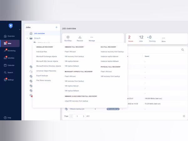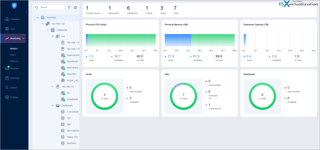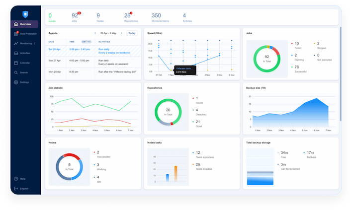 Nakivo est livrée avec une interface riche en fonctionnalités, dotée d’indicateurs efficaces, simples et visuels, vous permettant de garder rapidement et en toute simplicité un œil sur l’état de santé de vos sauvegardes.